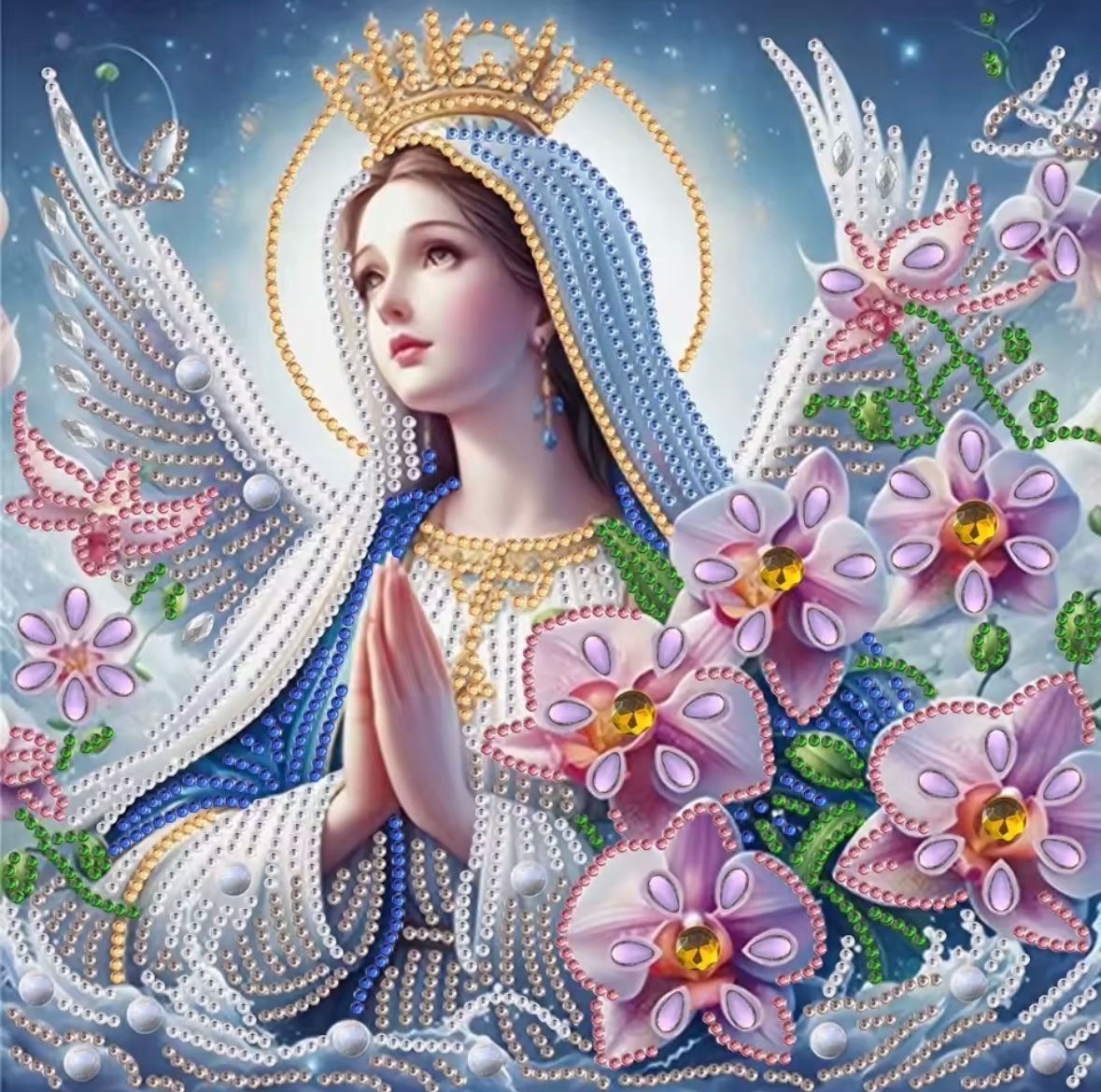 Here is an Angel Diamond Painting Kit. Size is approximately 30cm by 30cm. This is a partial picture with round diamond dots and other size diamond dots. The kits come with a picture, diamond dots, tray, tool and wax.