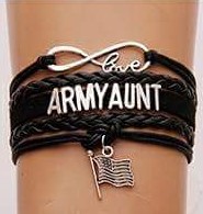 Army Aunt Wrapped Bracelet. This Bracelet is Black. With silver charms. The bracelets come with a adjustable links that will fit up to a 9" wrist. There is a silver color lobster clasp.