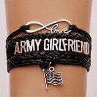 Army Girl Friend Wrapped Bracelet. This Bracelet is Black. With silver charms. The bracelets come with a adjustable links that will fit up to a 9" wrist. There is a silver color lobster clasp.