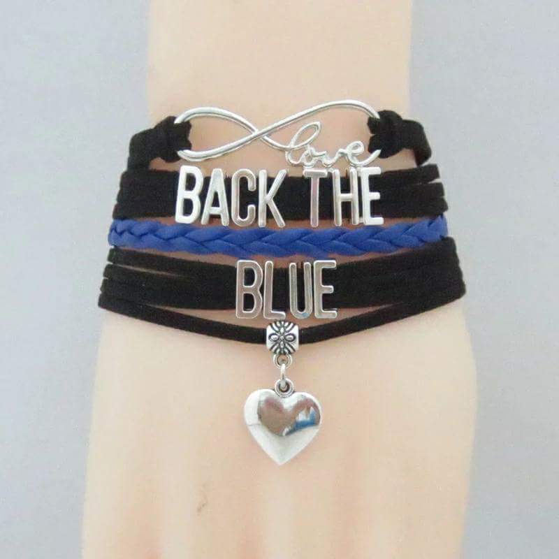 Back The Blue Wrapped Bracelet. This Bracelet is Black and Royal Blue. With silver charms. The bracelets come with a adjustable links that will fit up to a 9" wrist.