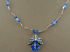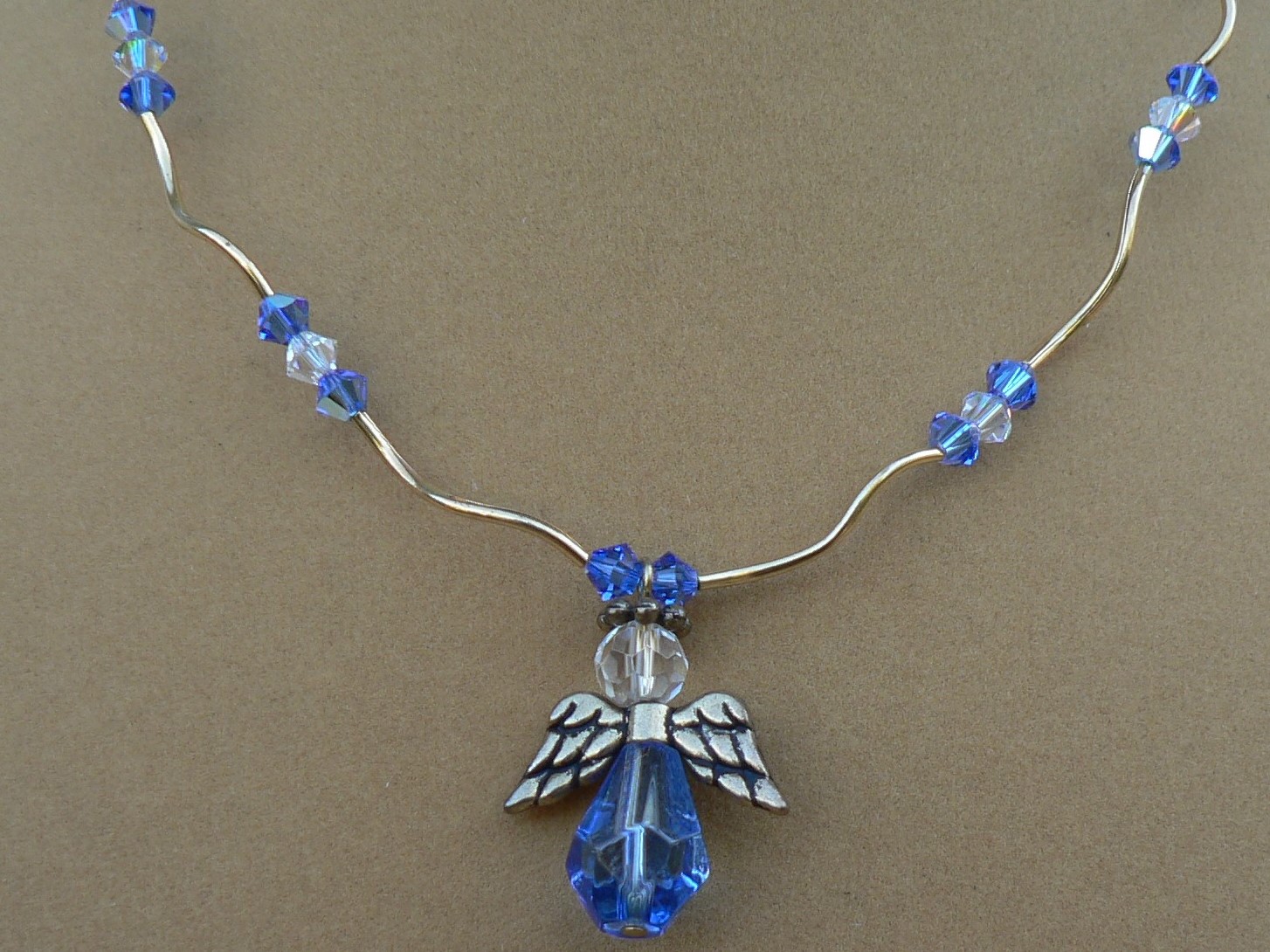 Here is a Blue Angel Necklace. The wings are gold plated with a blue bead for the body and a clear bead for the head, to make an angel. There is Sapphire Swarovski Crystal Bicone and Crystal Swarovski AB Bicone. There is gold plated wavy tubes in between the Swarovski Crystals. The necklace is 20" long with a 3" gold plated extension chain. There is a gold plated magnet and a gold plated lobster clasp.