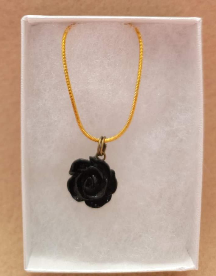 Here is a beautiful Black Flower Necklace. This necklace has an approximate 18" gold plated chain.