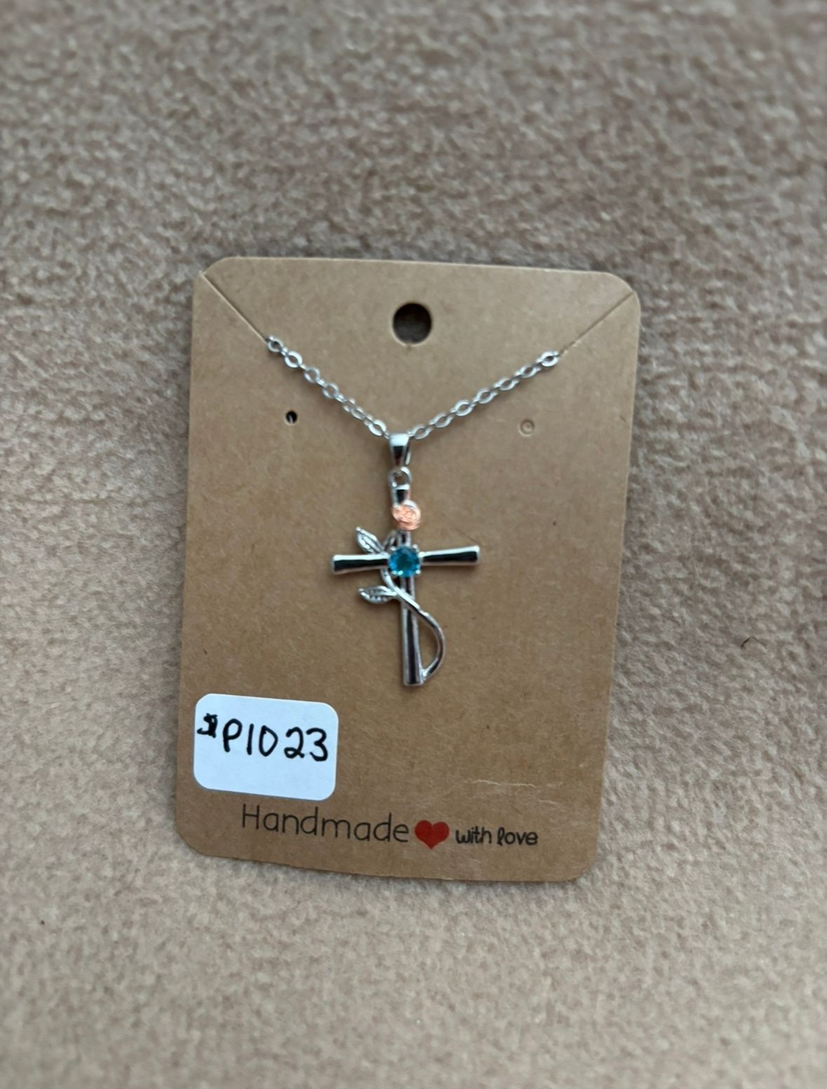Here is a silver color cross with a blue stone and a rose. The chain is 17” long.