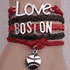 Here is a Boston Wrap Bracelet. The bracelet is Black and Red Color. The Bracelet is 6 1/2" long with a 2" extension chain. There is a silver color baseball charm on the bottom of the bracelet. There is a love charm on the top of the bracelet. In the middle of the bracelet there is silver color letter that say Boston. What a great bracelet to have if you are a Boston fan.
