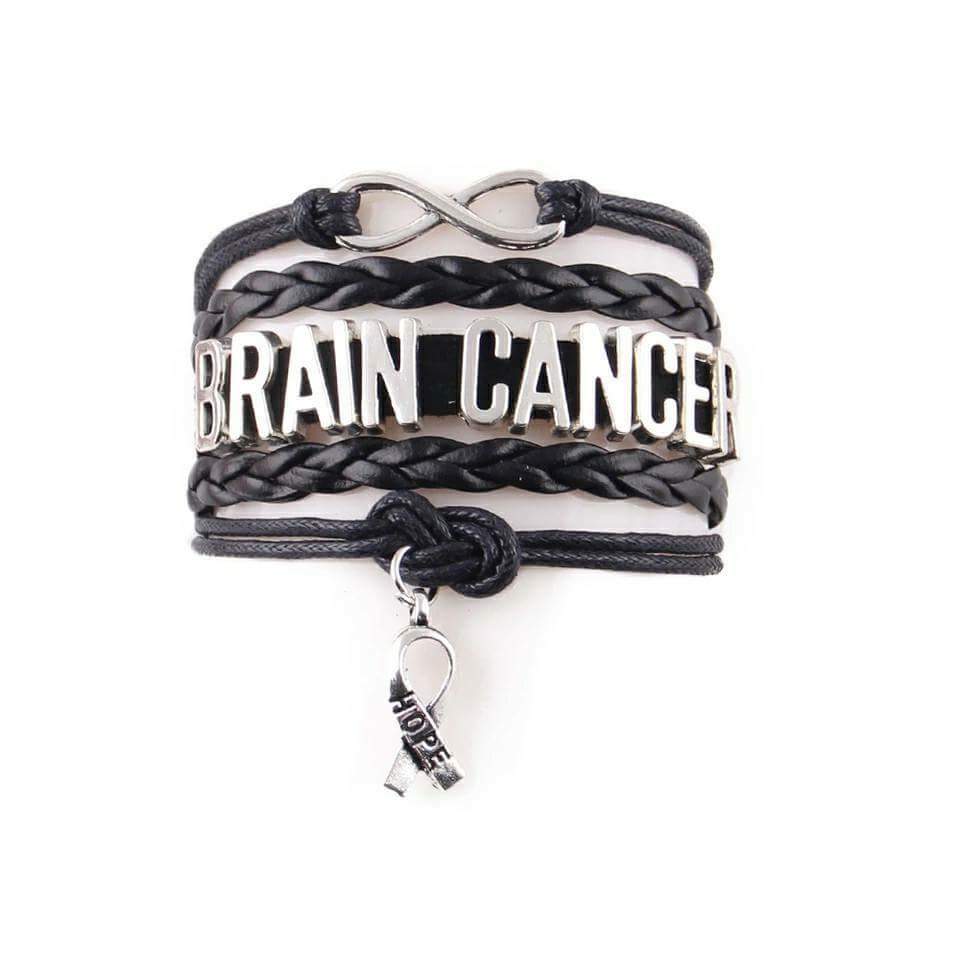 Brain Cancer Wrapped Bracelet. This Bracelet is Black. With silver charms. The bracelets come with a adjustable links that will fit up to a 9" wrist. There is a silver color lobster clasp.