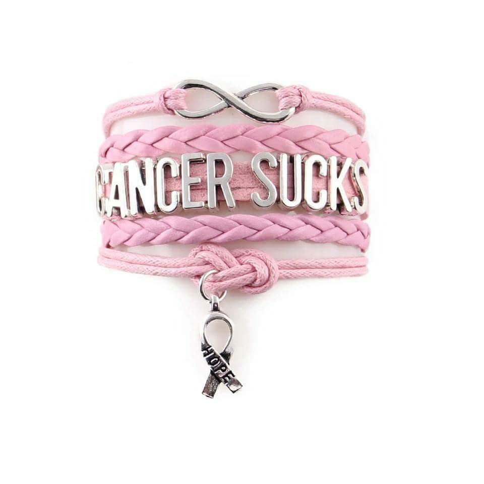 Cancer Sucks Wrapped Bracelet. This Bracelet is Pink. With silver charms. The bracelets come with a adjustable links that will fit up to a 9" wrist. There is a silver color lobster clasp.