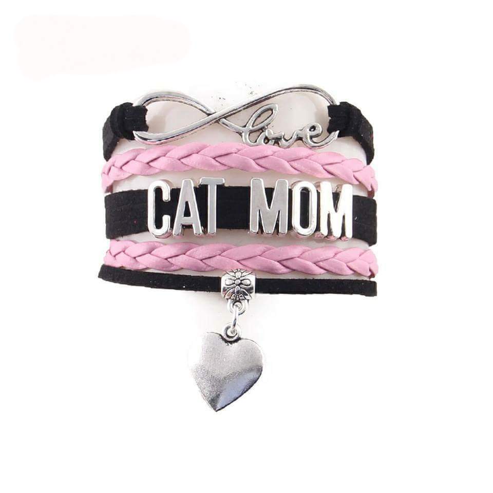 Cat Mom Wrapped Bracelet. This Bracelet is Black and Pink. With silver charms. The bracelets come with a adjustable links that will fit up to a 9" wrist. There is a silver color lobster clasp.