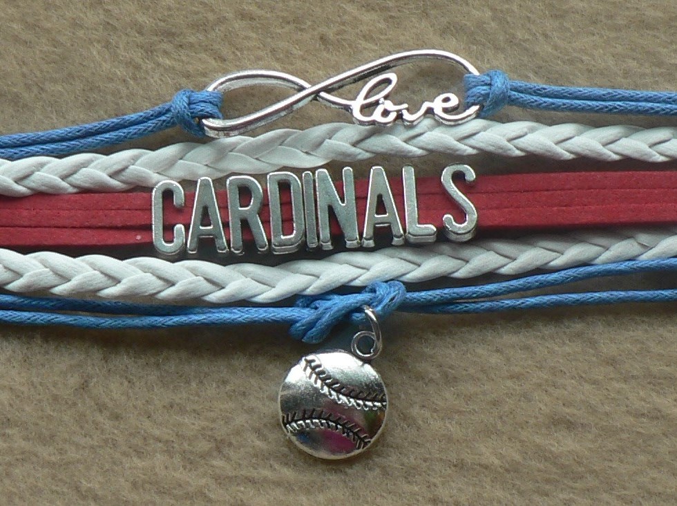 Here is a Cardinals Wrap Bracelet. The bracelet is Navy Blue, White and Red Color. The Bracelet is 6 1/2" long with a 2" extension chain. There is a silver color baseball charm on the bottom of the bracelet. There is a infinity love charm on the top of the bracelet. In the middle of the bracelet there is silver color letter that say Cardinals. What a great bracelet to have if you are a Cardinals fan.