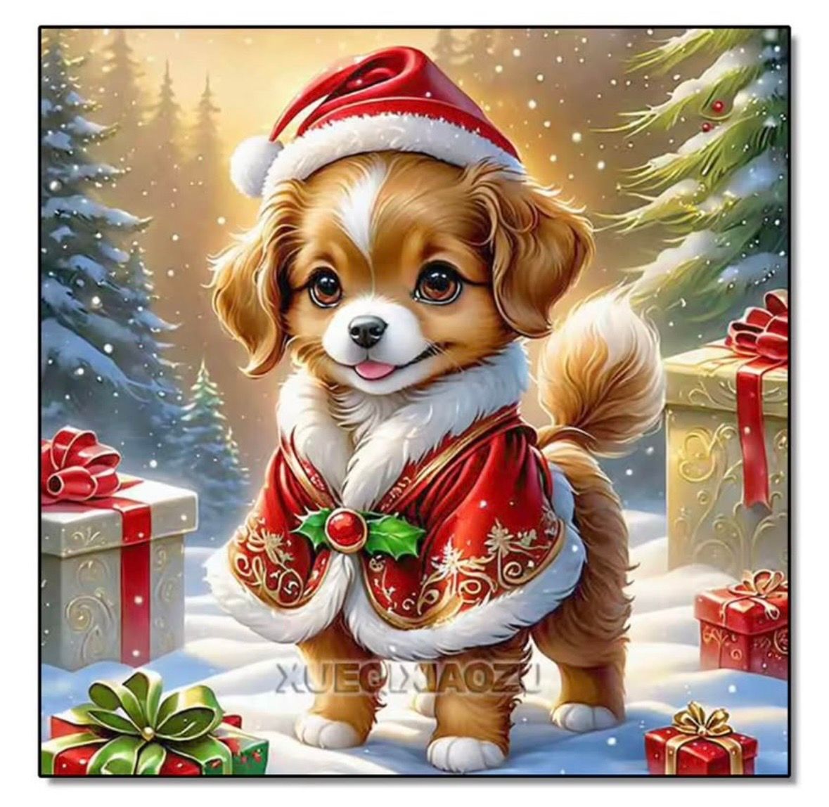Christmas Dog Diamond Painting Kit for sale. Size is approximately 30cm by 30cm. This is a full picture with round diamond dots. The kits come with a picture, diamond dots, tray, tool and wax.