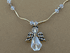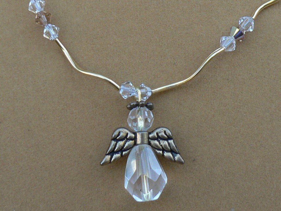 Here is a Clear Angel Necklace. The wings are gold plated with a clear beads to make a angel. There is Crystal Swarovski Crystal Bicone and Light Smoke Topaz Swarovski AB Crystal Bicone. There is gold plated wavy tubes in between the Swarovski Crystal. The necklace is 20" long with a 3" gold plated extension chain. There is a gold plated magnet with a gold plated lobster clasp.