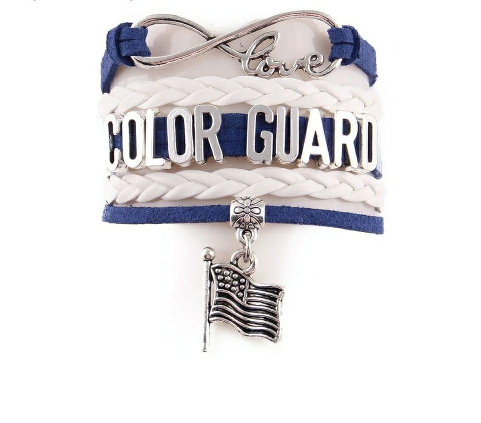 Color Guard Wrapped Bracelet. This Bracelet is Royal Blue and White. With silver charms. The bracelets come with a adjustable links that will fit up to a 9" wrist. There is a silver color lobster clasp.