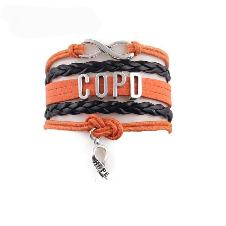 COPD Wrapped Bracelet. This Bracelet is Orange and Black. With silver charms. The bracelets come with a adjustable links that will fit up to a 9" wrist. There is a silver color lobster clasp.