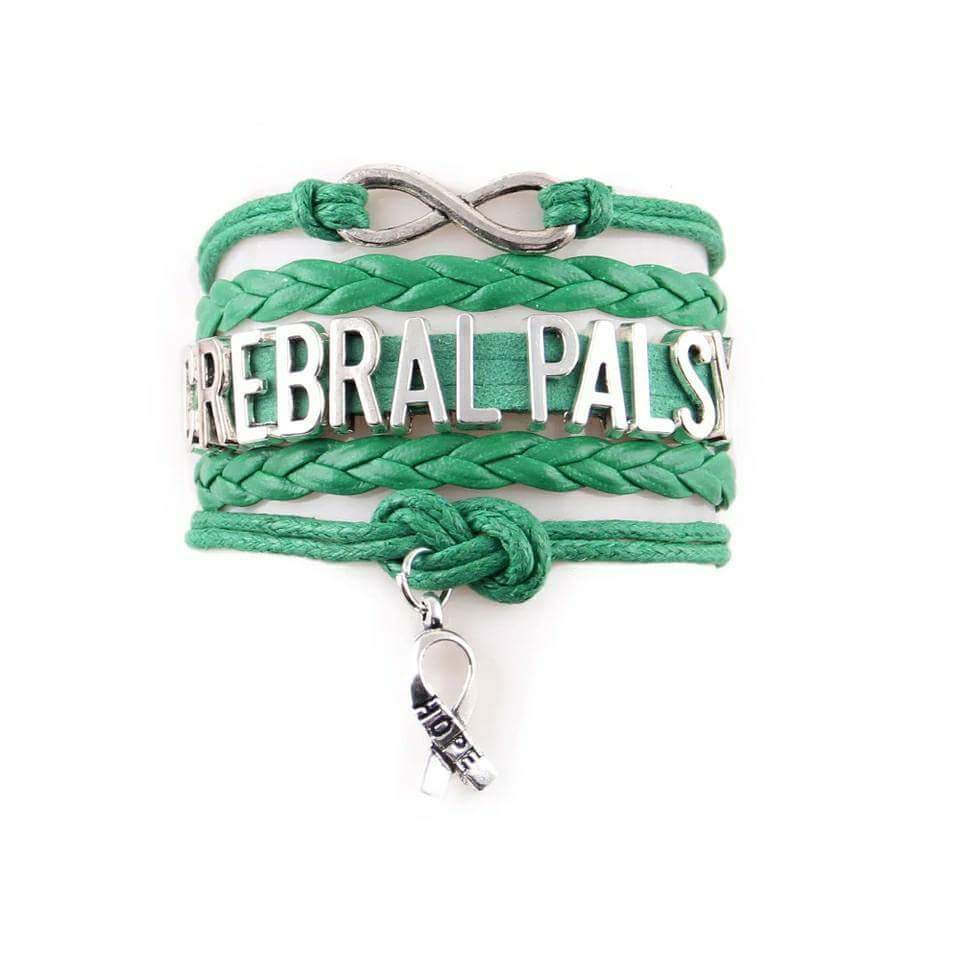 Crebral Palsy Wrapped Bracelet. This Bracelet is Green. With silver charms. The bracelets come with a adjustable links that will fit up to a 9" wrist. There is a silver color lobster clasp.