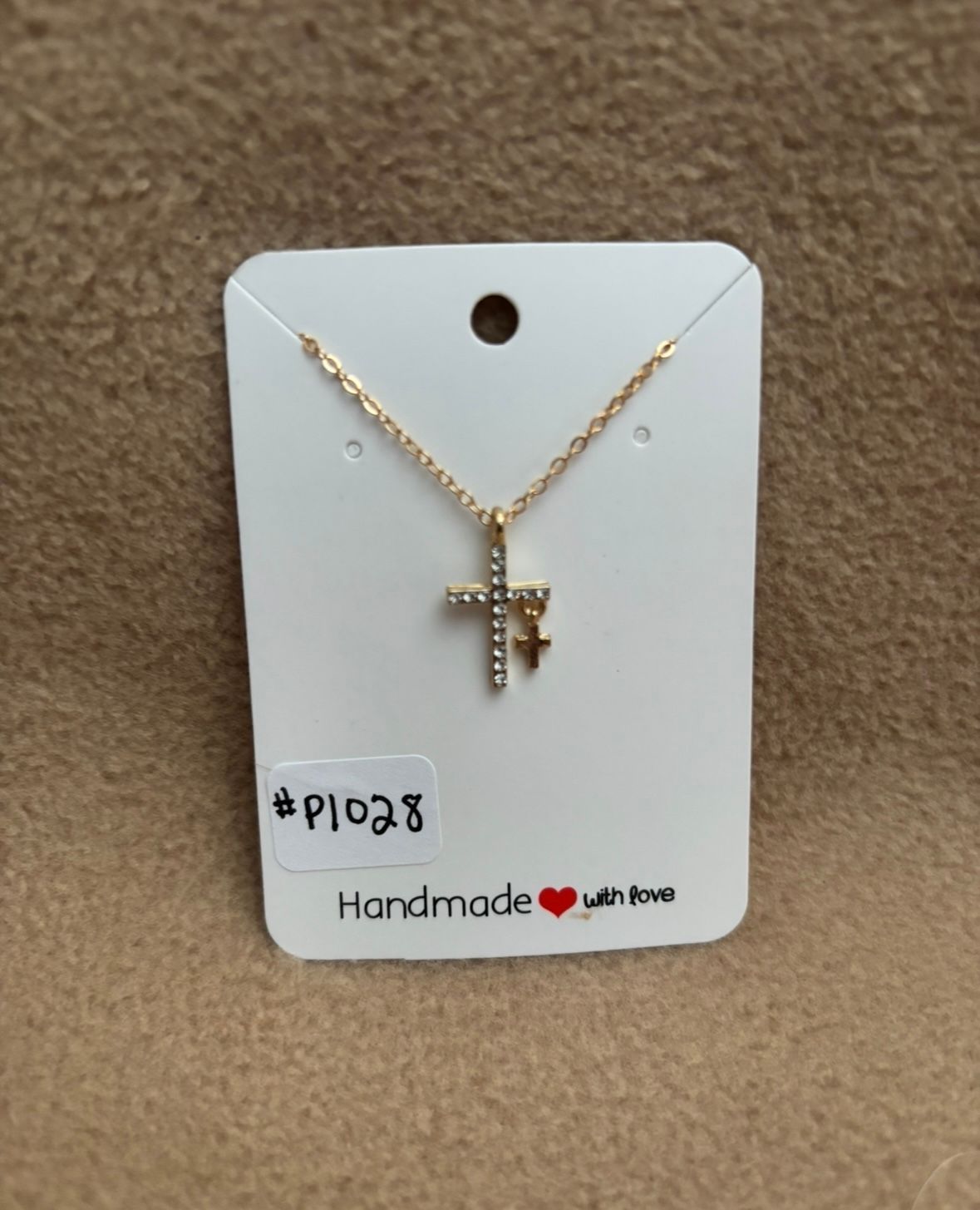 Here is a gold color cross with a small cross and chain. The chain is approximately 17” with 2” extension.