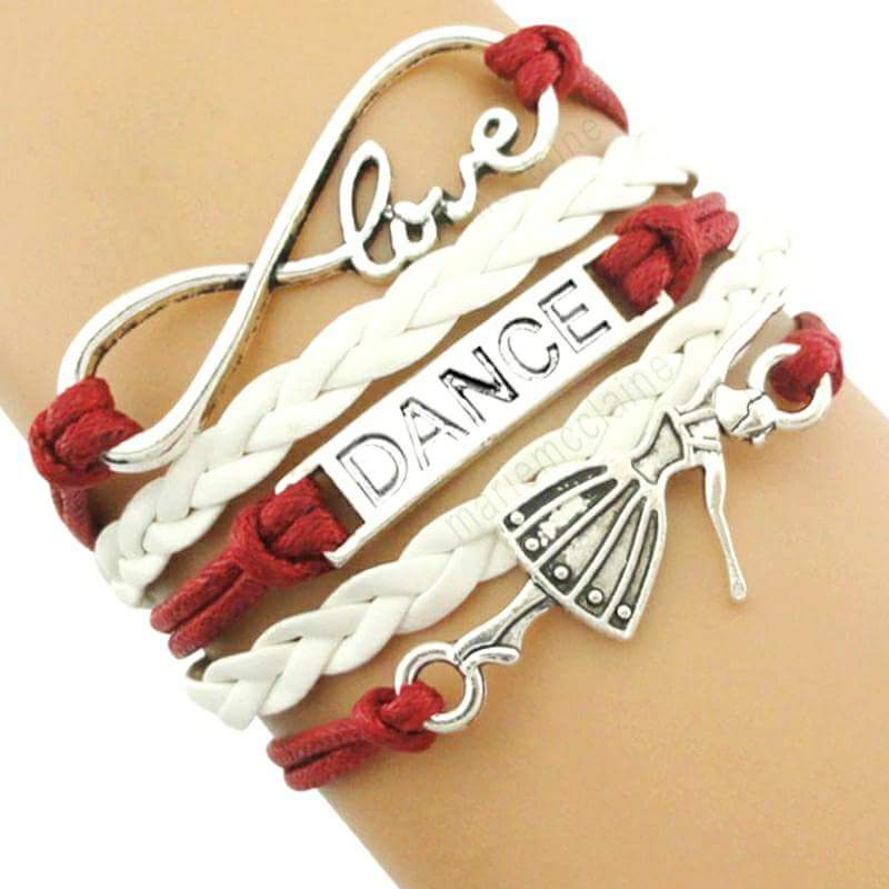 Dance Charm Wrapped Bracelet. This Bracelet is Red and Black. With silver charms. The bracelets come with a adjustable links that will fit up to a 9" wrist. There is a silver color lobster clasp.