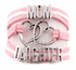 Here is a Mom Loves Daughter Wrap Bracelet. The bracelet is Light Pink and White Color. The Bracelet is 6 1/2" long with a 2" extension chain. On top of the bracelet of the bracelet there is silver color letter that say mom and the bottom says daughter. In the middle there is a double heart charm.