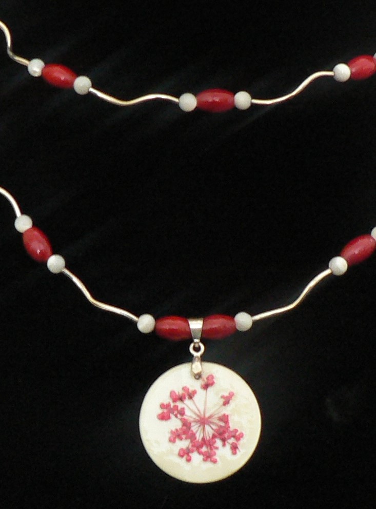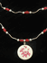 Double Stand Circle Seashell Pendent Necklace with red flower on the seashell. The necklace has red oval beads with white selenite beads between silver tubes. There is silver plated lobster clasp with magnet. The shortest stand is 17" and the longest is 19" with a 2" extension chain.