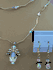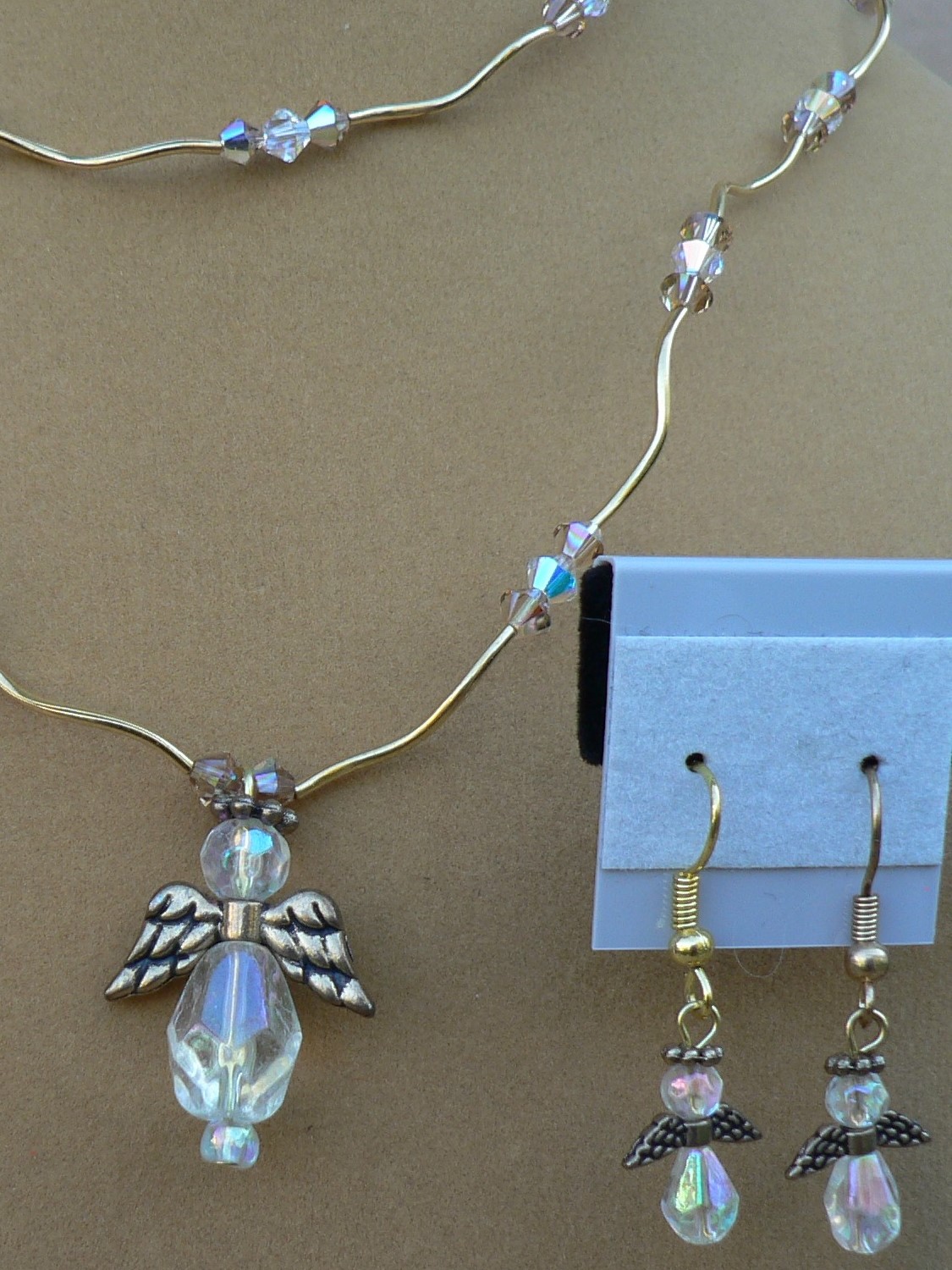 Here is a Double Stand Clear Angel Necklace. There is gold plated wings with clear stones to make a angel. There is Light Smoke Topaz AB Swarovski Crystals Bicone and Crystal AB Swarovski Bicone Beads. In Between the Swarovski Crystals there is gold plated wavy tubes. The shorts stand on the necklace is 18" and the longest stand is 20" with a 3" gold plated extension chain. There is a gold plated magnet with a gold plated lobster clasp. With the earrings there is gold plated wings with clear beads to make a angel. Normally the earrings cost $7.50 but with buying the earrings and necklace together, you are only paying $35.00 for the set.