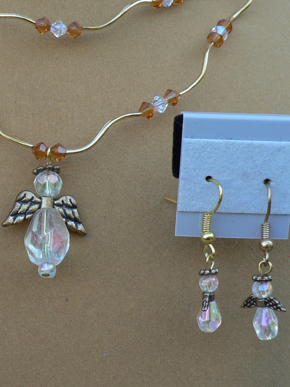 Here is a Beautiful Double Stand Angel Necklace. The wings are gold plated with a clear bead that makes a angel. There is Topaz Swarovski Crystal and Crystal AB Swarovski Crystal. There is gold plated wavy tubes in between the Swarovski Crystal. The shortest stand on the necklace is 18" and the longest stand is 20". There is a 3" gold plated extension chain. There is a gold plated magnet and a gold plated lobster clasp. With the earrings there is gold plated wings with clear beads to make a angel. Normally the earrings cost $7.50 but with buying the earrings and necklace together you are only paying $35.00 for the set.