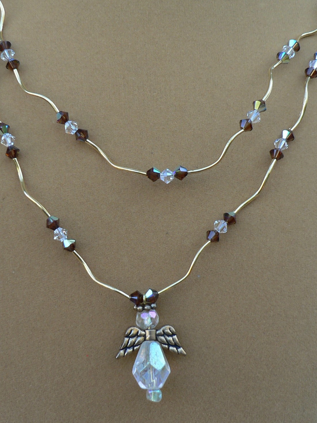 Here is a Beautiful Double Stand Angle Necklace. The wings a gold plated with clear beads to make a angel. There is Smoked Topaz AB Swarovski Crystal Bicone and Crystal Swarovski Crystal. There is gold plated tubes in between the Swarovski Crystal. The shortest stand on the necklace is 18" and the longest stand is 20". There is a 3" gold plated extention chain. There is gold plated magnet with a gold plated lobster clasp.