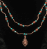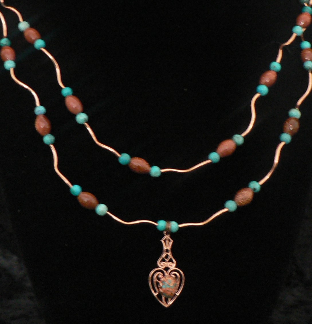 Here is a Double Stand Copper Heart Pendent Necklace. There is Goldstone Oval Beads and 6mm Round Turquoise Beads. There is copper wavy tubes in-between the beads. The longest stand is 22" and the shortest stand is 20" with a 3" copper extension chain. There is a copper magnet with a copper lobster clasp.