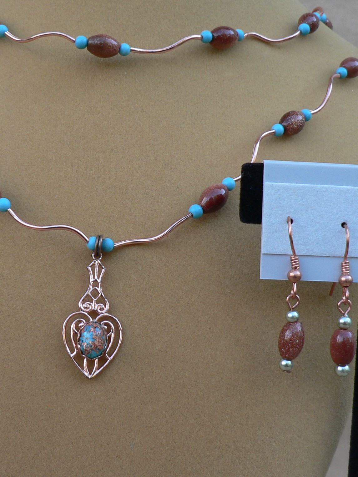 Here is a Double Stand Copper Heart Pendent Necklace. There is Goldstone Oval Beads and 2mm Round Turquoise Beads. There is copper wavy tubes in-between the beads. The longest stand is 21" and the shortest stand is 19" with a 3" copper extension chain. There is a copper magnet with a copper lobster clasp. Normally the earrings are $7.50 but if you buy the earring and necklace together, you save $2.50. You only pay $45.00 for the set.