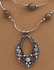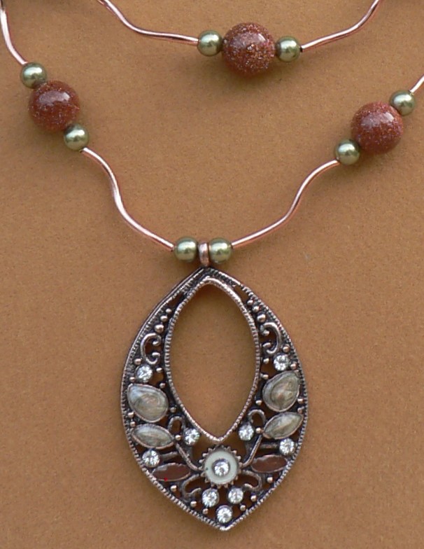 There is a Double Copper Teardrop Necklace. There is 8mm round goldstone beads and green round beads. There is copper wavy tubes in between the beads. The necklace is 19" long and the shortest stand is 17" with a 3" copper extension chain. There is a copper magnet with a copper lobster clasp.