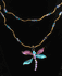 Here is a Purple and Blue Dragonfly Necklace. There Sapphire AB and Violet Swarovski Crystal in-between gold plated wavy tubes. The shortest stand is 18" long and the longest is 20" long with a 2" extension chain. There is a gold plated magnet and a lobster clasp. This is a double necklace.