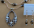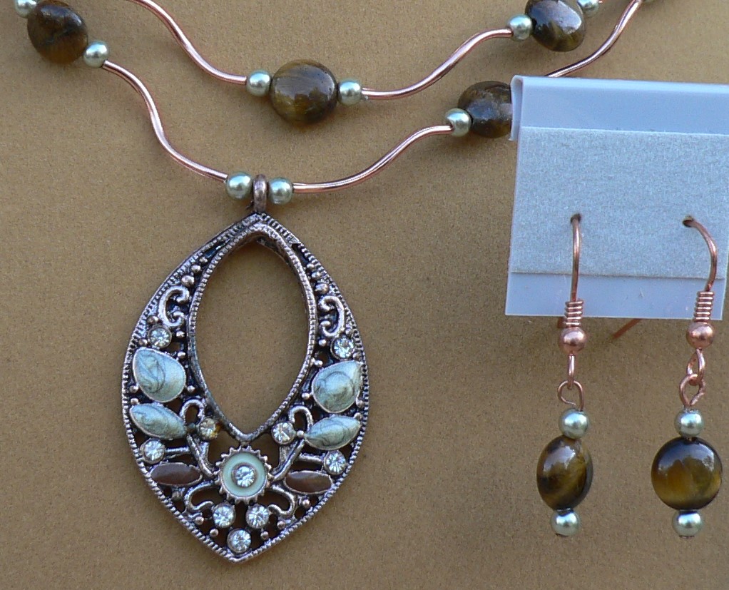 There is a Copper Teardrop Necklace. There is flat round tiger-eye bead with green round beads. There is copper wavy tubes in between the beads. The necklace is 19" long with a 3" copper extension chain. There is a copper magnet with a copper lobster clasp. Normally the earrings cost $7.50 but if you buy the earrings and necklace together, you save $2.50. You only pay $45.00 for the set.
