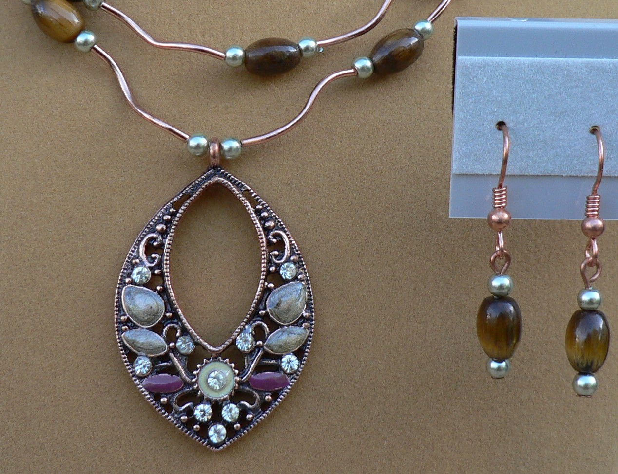 There is a Copper Teardrop Necklace. There is oval tiger-eye bead with green round beads. This necklace has a double stand of beads and wavy tubes. There is copper wavy tubes in between the beads. The necklace is 19" long and the shortest stand is 17" long with a 3" copper extension chain. There is a copper magnet with a copper lobster clasp. Normally the earrings cost $7.50 but if you buy the necklace and earrings together, you save $2.50. You only pay $45.00 for the set.