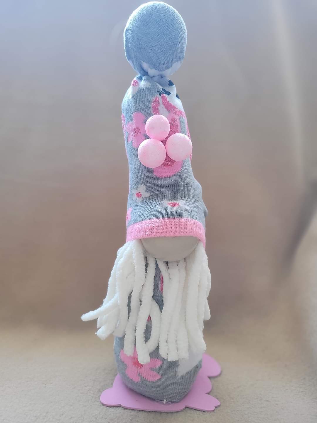 Here is a Easter Gnome with bunny, flower and a white beard. Measurements are approximate Width 3", Depth 4", Height 11". These gnomes are made out of socks, stuffing, felt heart and ping pong balls.