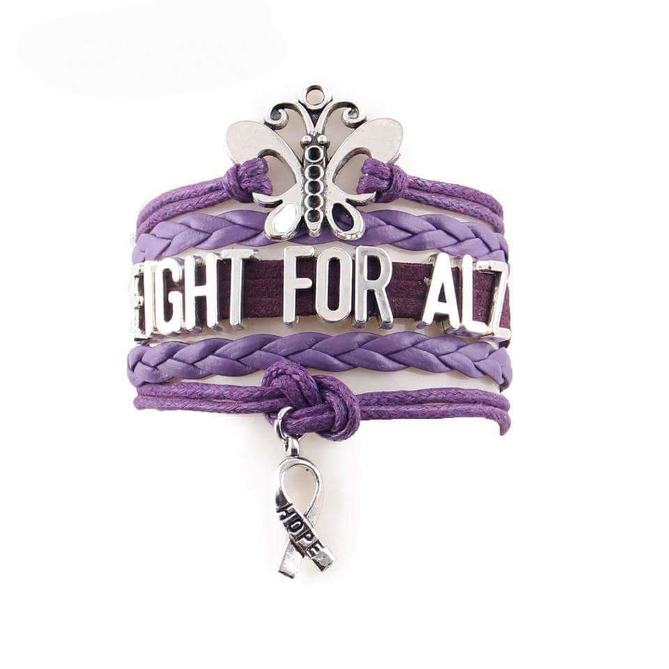Fight For ALZ Wrapped Bracelet. This Bracelet is Purple and Light Purple. With silver charms. The bracelets come with a adjustable links that will fit up to a 9" wrist. There is a silver color lobster clasp.