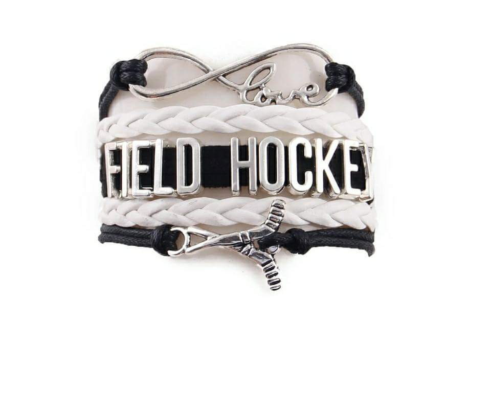 Field Hockey Wrapped Bracelet. This Bracelet is Black and White. With silver charms. The bracelets come with a adjustable links that will fit up to a 9" wrist. There is a silver color lobster clasp.