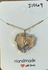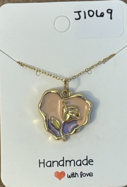 Here is a flower with a heart necklace. The background is pink and purple. The backing of the charm is gold color. The chain is 17” with a 2” extension.
