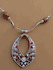There is a Copper Teardrop Necklace. There is oval goldstone with green round beads. There is copper wavy tubes in between the beads. The necklace is 19" long with a 3" copper extension chain. There is a copper magnet with a copper lobster clasp.
