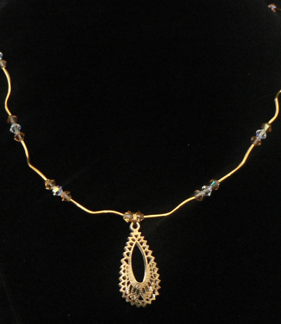 Here is a Gold Plated Teardrop Necklace. There is Colorado Topaz and Crystal AB Swarovski Crystal. The Necklace has gold plated wavy tubes in-between the Swarovski Crystal. The necklace is 20" long with a 2" gold plated extension chain. There is a gold plated magnet and a gold plated lobster clasp.