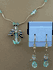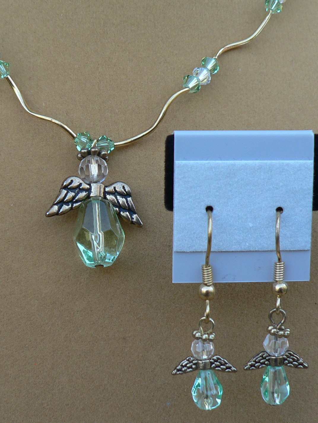 Here is a Green Angel Necklace. The wing is gold plated with a green bead for the body and a clear bead for the head, to make the angel. There is Peridot Swarovski Crystal Bicone and Crystal Swarovski AB Bicone. There is gold plated wavy tubes in between the beads. The necklace is 20" long with a 3" gold plated extension chain. There is a gold plated magnet with gold color lobster clasp. The earrings wing are gold color with a green bead for the body and clear bead for the head. Normally the earrings are $7.50 but if you buy the earrings and necklace together, you only pay $30.00 for the set.