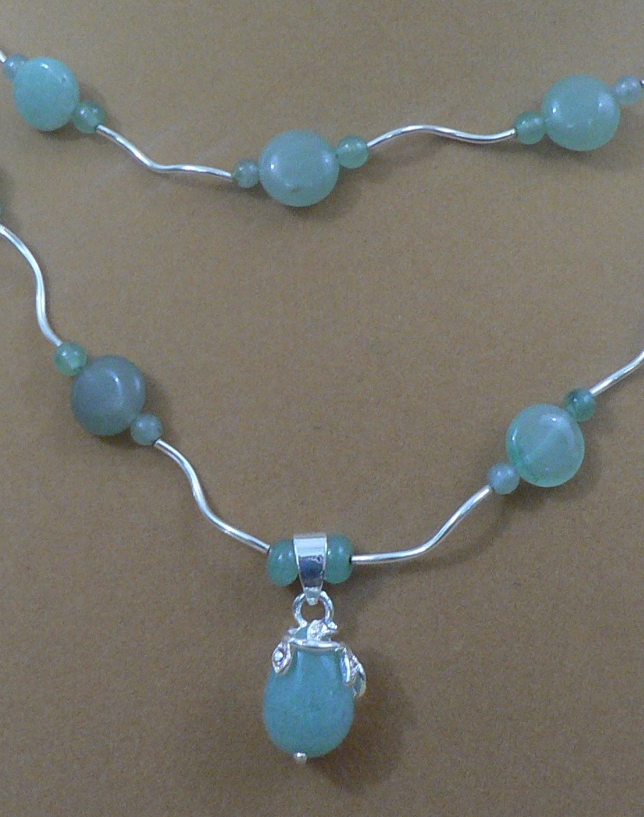 Here is a Green Aventurine Oval Pendent. There is green aventurine oval flat beads and round beads in-between silver plated wavy tubes. The shortest stand is 18" and the longest stand is 20" with a 2" silver plated extension chain. The is silver plated magnet and lobster clasp. This is a double stand necklace.