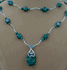 Green Cabochon Malachite Pendent Necklace. Azurite flat round beads and round beads with silver wavy tubes in-between the beads. This is a double stand necklace. The shortest stand is 19" and the longest stand is 21" with a 2" extension chain. There is a silver magnet with a lobster clasp. This is a double stand necklace.