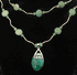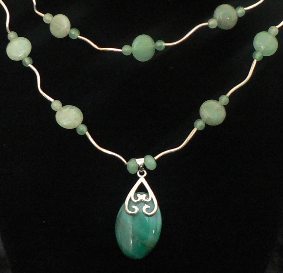 Here is a Green Malachite Cabochons Pendent Necklace. There is green aventurine flat and round beads in-between silver plated wavy tubes. the shortest strand is 18" and the longest stand is 20" long with a 2" extension chain. There is a silver plated magnet and lobster clasp. This is a double stand necklace.