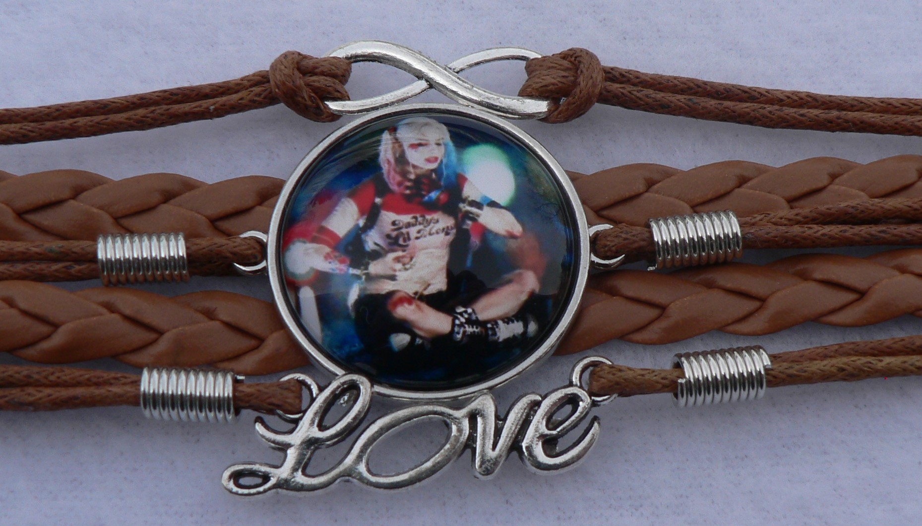 Here is a Harley Quinn Leather Wrap Bracelet. High Quality Glass Multilayer Brown Leather Bracelet Bangles Steampunk Harley Quinn Commando Suicidal Joker. There is a silver infinity charm on top and a silver love charm on the bottom. The leather is brown, with a silver plated lobster clasp and a 2" sliver plated extension chain. The bracelet is 6" long.