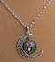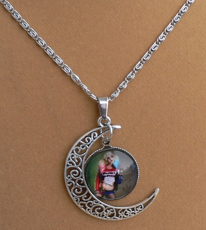 Fashion Jewelry Vintage Glass Necklace With Crescent Moon For Girls Best Gift Steampunk Harley Quinn Commando Suicidal Joker. There is a silver plated crescent moon with a silver plated chain. There is a silver plated lobster clasp. The necklace is 17" long.