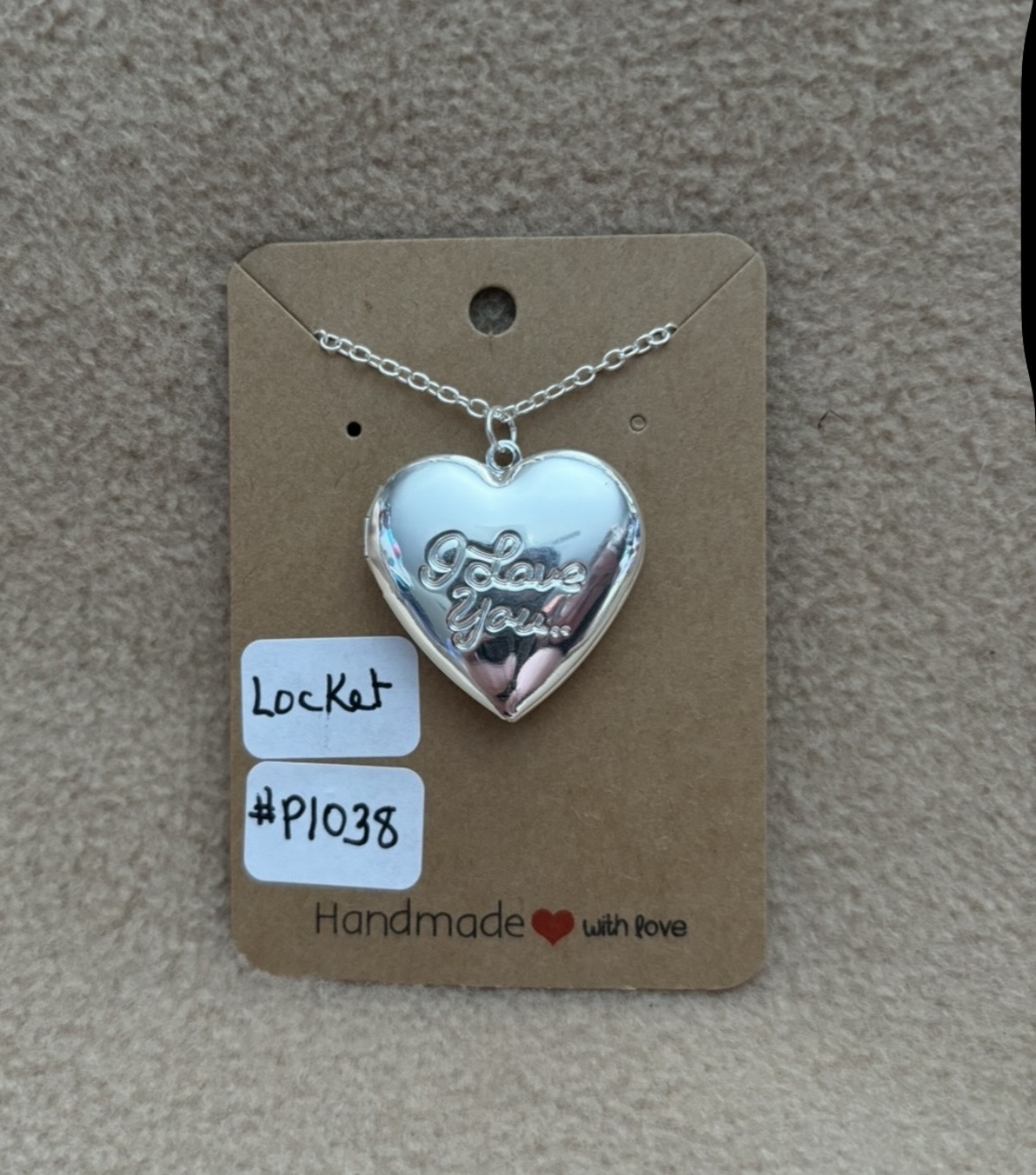 Here is a heart locket that says I love you necklace. It is silver color. You can put pictures of love ones in this locket. The chain is 16” with a 1 1/2” extension.
