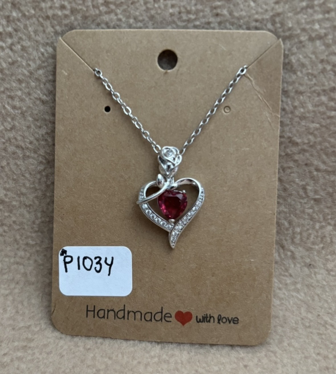 Here is a rhinestone heart necklace with a dark pink heart in the middle and a rose on the heart. This is a sliver tone necklace. The chain is 17”.