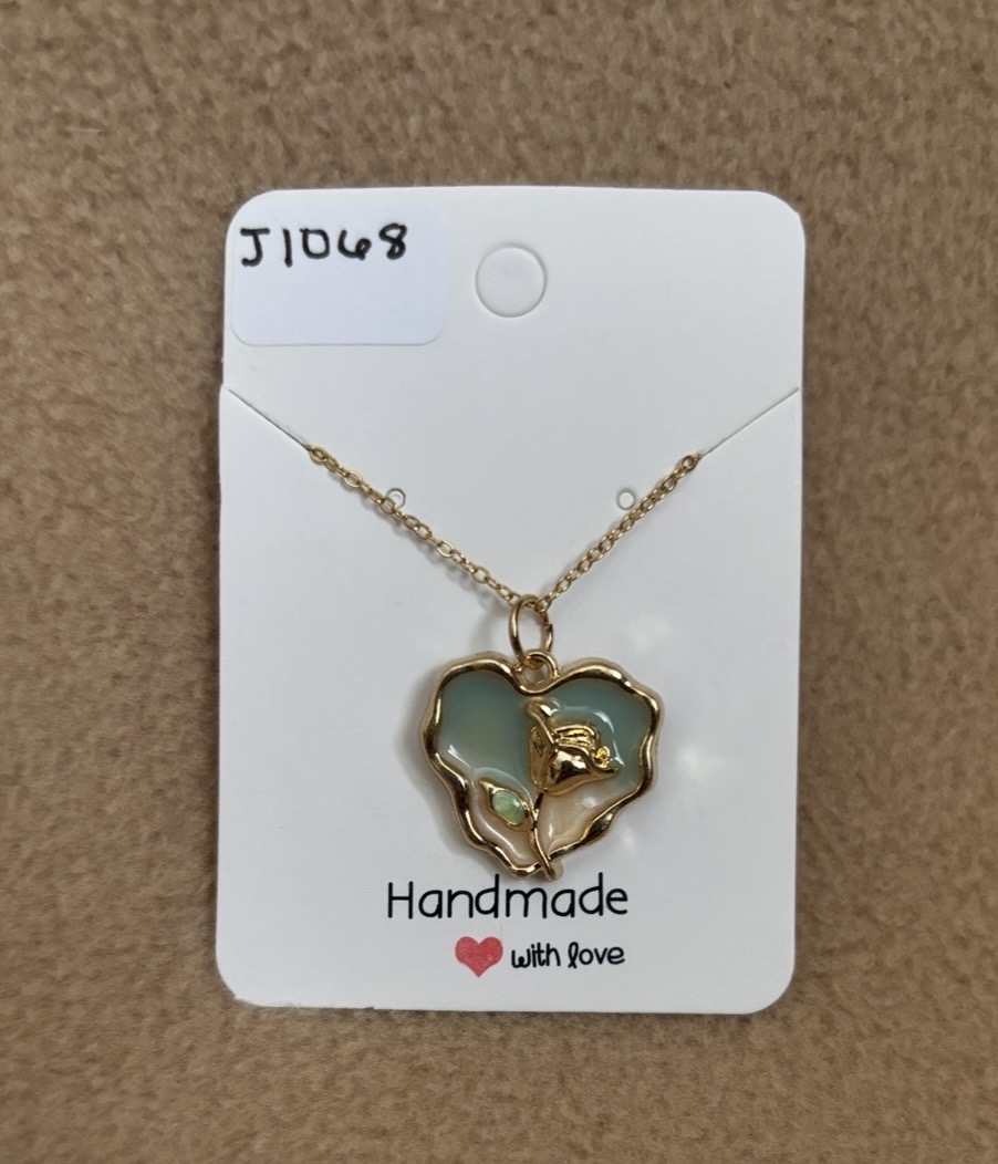 Here is a beautiful heart necklace with a flower. There is a teal and peach background. The backing is a gold color. The chain is 17” with a 2” extension.