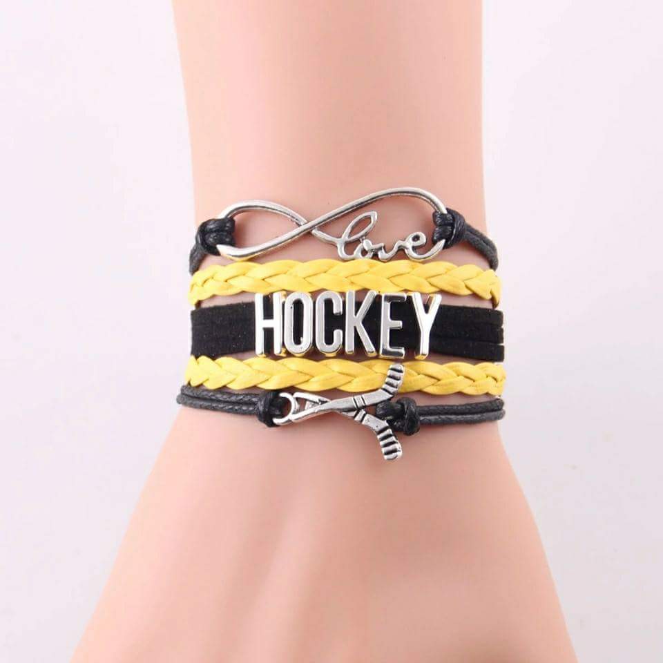 Hockey Wrapped Bracelet. This Bracelet is Black and Yellow. With silver charms. The bracelets come with a adjustable links that will fit up to a 9" wrist. There is a silver color lobster clasp.