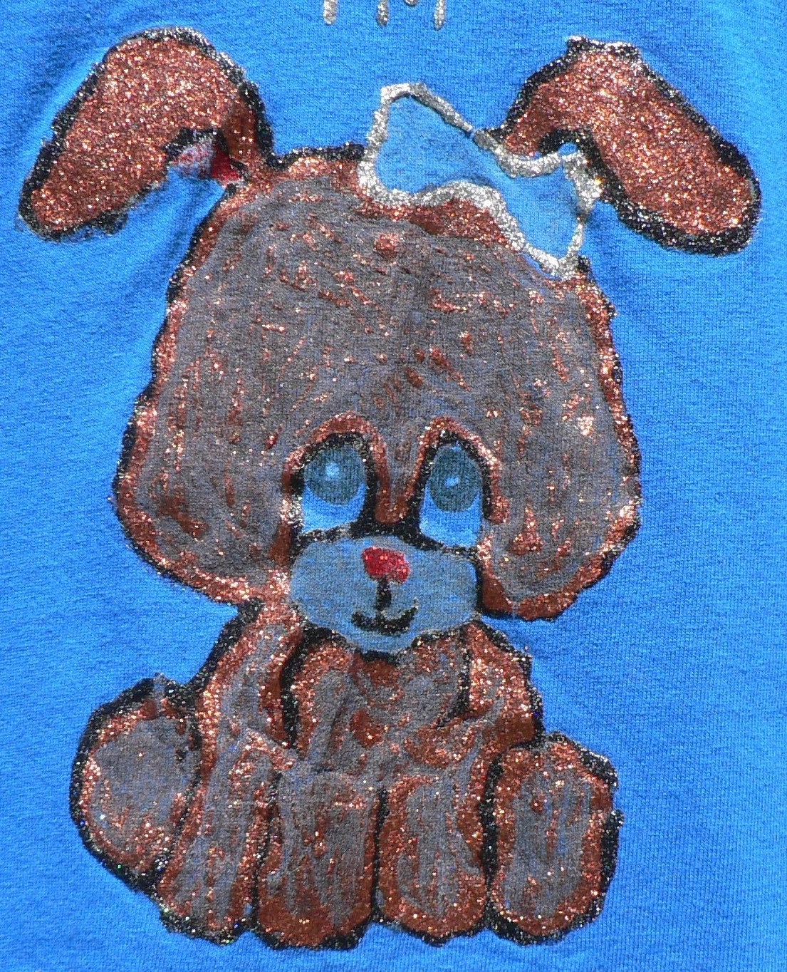 Here is a Large Blue Shirt with a bunny painted on the shirt. These shirts are hand painted. There is wording on the shift with silver paint, that say I'm Somebunny Special.
