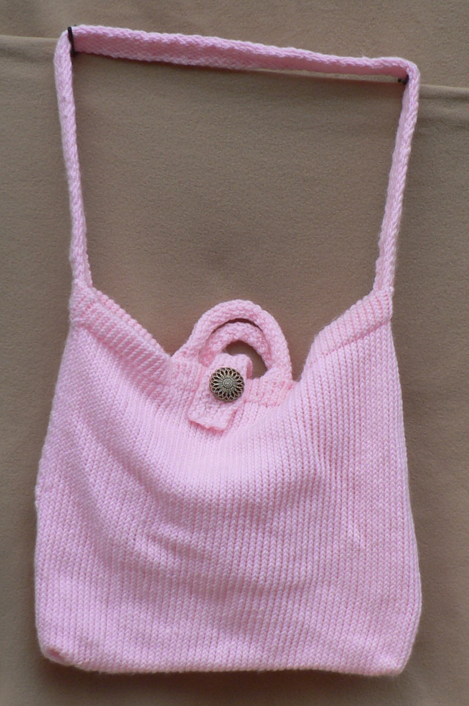 Here is a very nice pink knitted bag. This bag has many possibilities. You can use this bag as a shoulder bag, dipper bag and a bag to put items you. This bag has a shoulder handle and two hand handles. There is a button strap to close this bag. This is a nice size bag. There is so many possibilities for the use of this bag.
