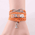 Leukemia Wrapped Bracelet. This Bracelet is Orange. With silver charms. The bracelets come with a adjustable links that will fit up to a 9" wrist. There is a silver color lobster clasp.