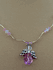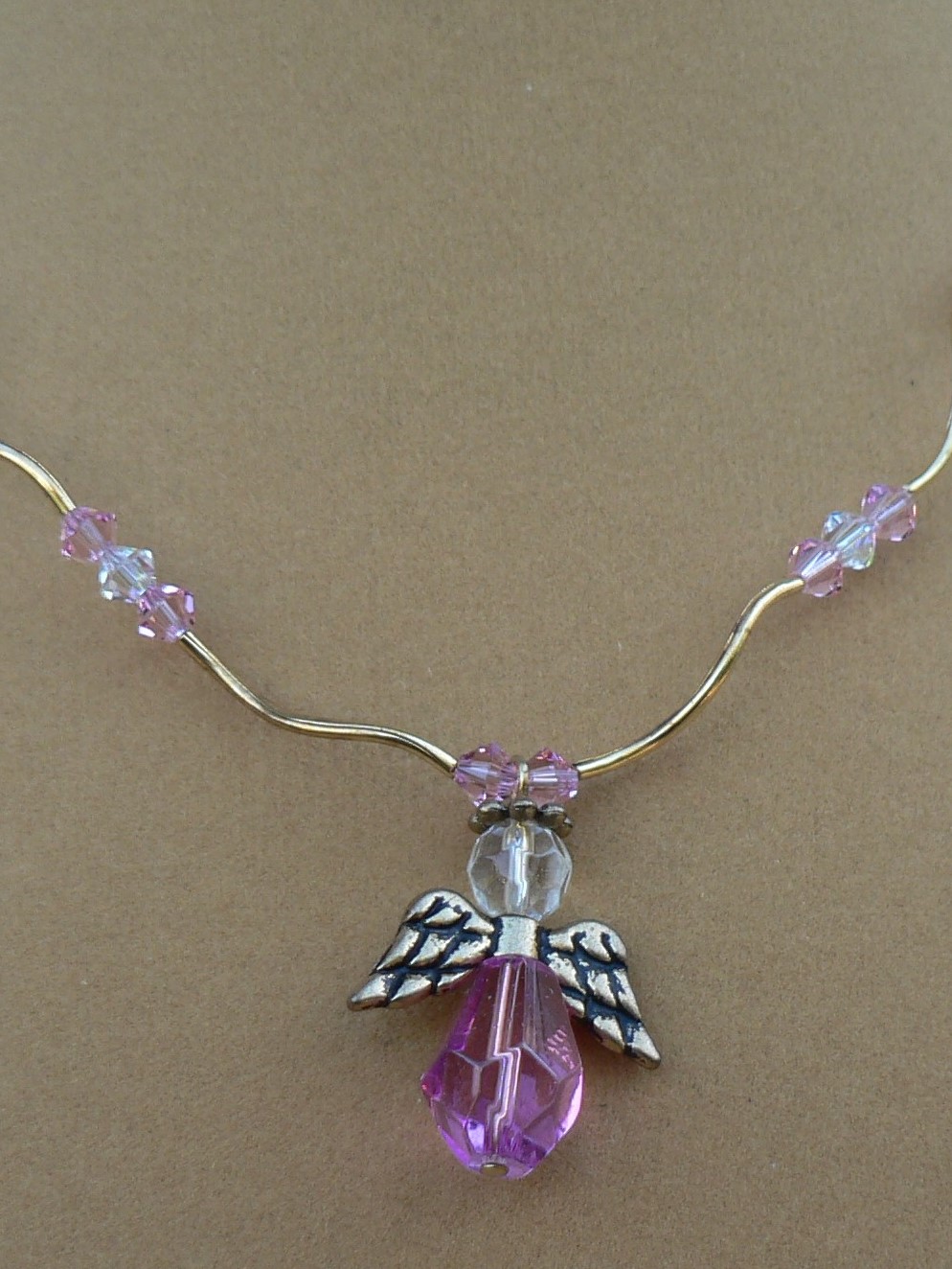 Here is a Light Rose Angel Necklace. The wing are gold plated with a light rose bead for the body and a clear bead for the head to make a angel. There is Light Rose Swarovski Crystal Bicone with Crystal Swarovski AB Bicone. There is gold plated wavy tubes in between the Swarovski Crystal. The necklace is 20" long with 3" gold plated extension chain. There is a gold magnet with a gold plated lobster clasp.